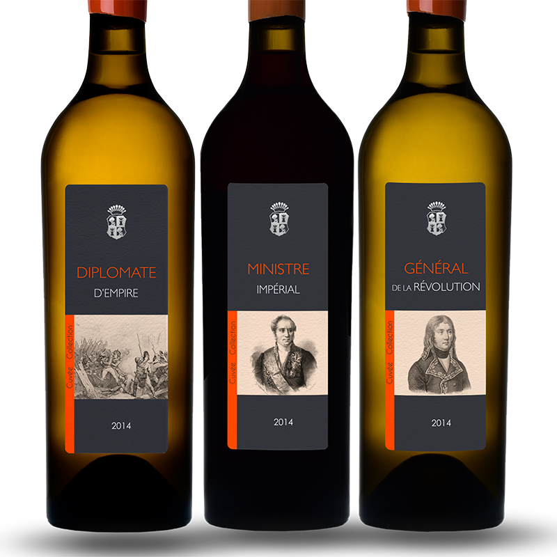 Concept : reprise des codes couleurs du domaine, harmonisation des images d’archive, renforcement de la lisibilité de la gamme avec mise en évidence des personnages historiques et signature cuvée collection.